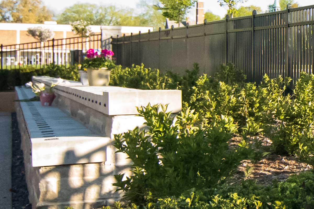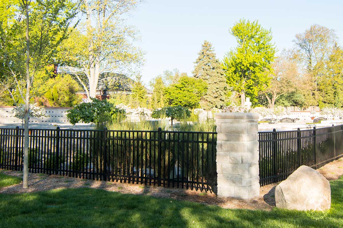 IFM Scope: Custom wrought-aluminum fencing in a rustic style for a columbarium expansion, complete with gates and bronze grave marker buttons.