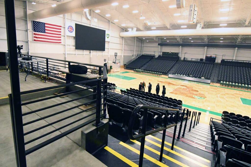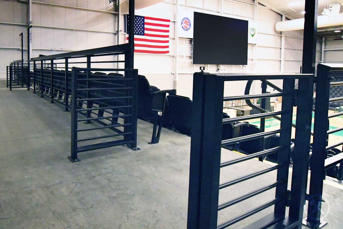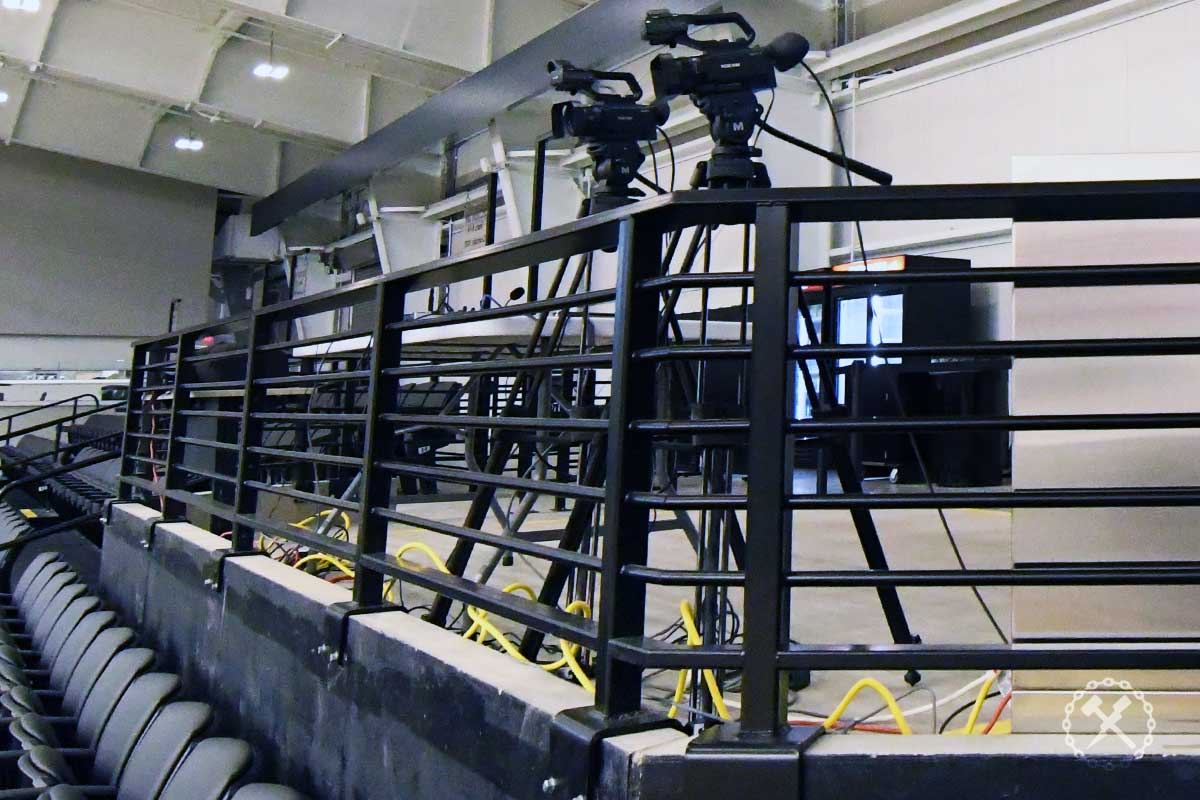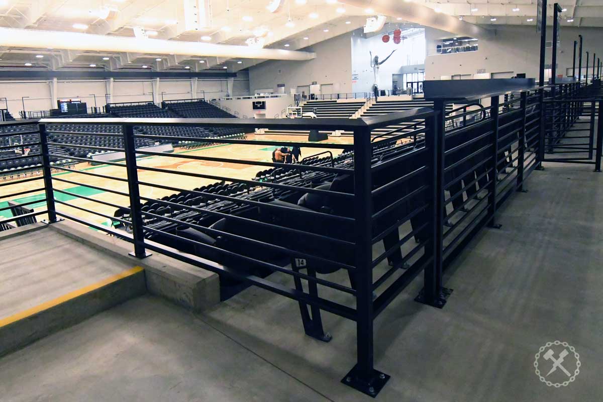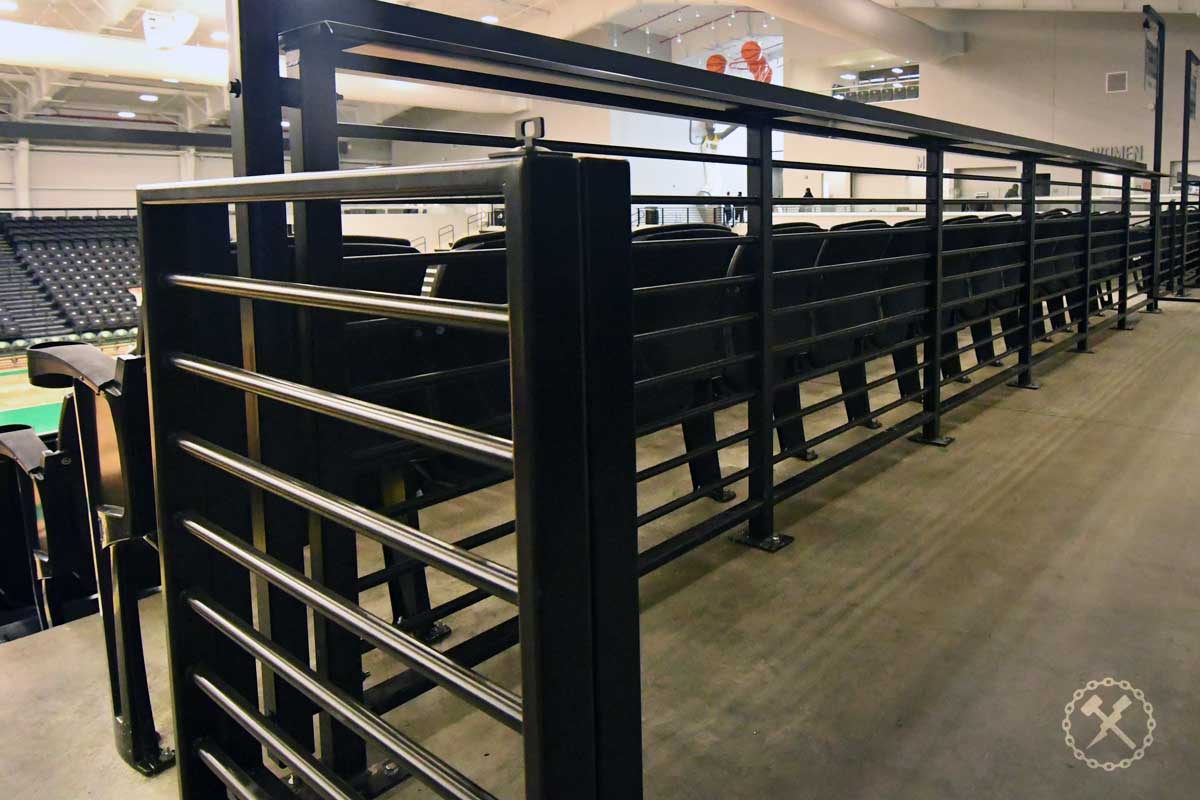 IFM Scope: Extensive package of custom-fabricated aluminum guard rails with integral drink ledges, plus access gates and riser stair rails for the new Wayne State University basketball stadium. We also provided the street sign style posts for the aisle markers.